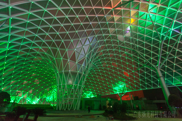 從建筑外立面上看,步步高廣場頗有特色。從外廣場外乘坐直達內部4樓的80米通天梯,外觀采用穿孔無規則效果,隨著電梯緩緩往上前行,城市之景逐步納入眼簾,景色遼闊。而項目的穹頂則采用了國家水立方式的穹頂設計,建筑天棚以鋼模結構為主,材質適用于投光、點光的照明手法。
