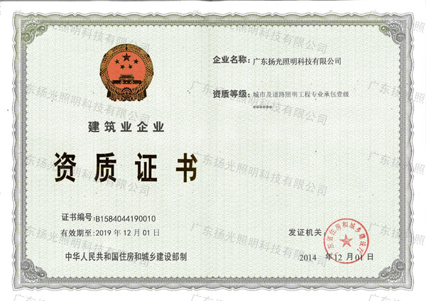12月初,在廣東城鄉及住房建設廳領導的大力堅持下,經國家住房和城鄉建設部審查核準,揚光照明取得“城市及道路照明工程專業承包壹級資質”。