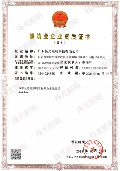 道路照明工程施工壹級,照明工程設(shè)計專項資質(zhì)甲級的“雙甲”企業(yè),“雙甲”資質(zhì)的取得體現(xiàn)了行業(yè)和市場對公司綜合實力的高度認可,意味著可以承接任何規(guī)模的